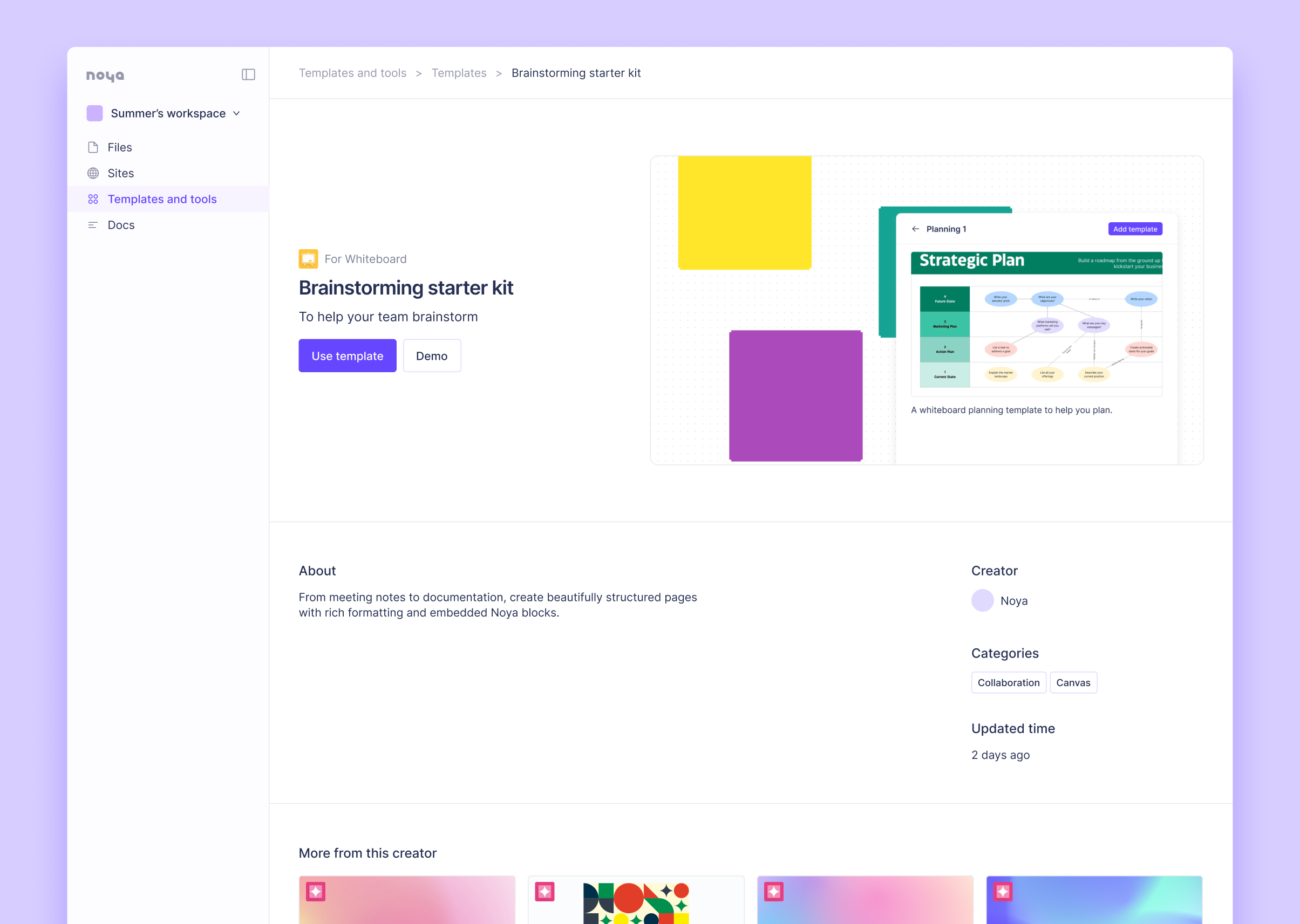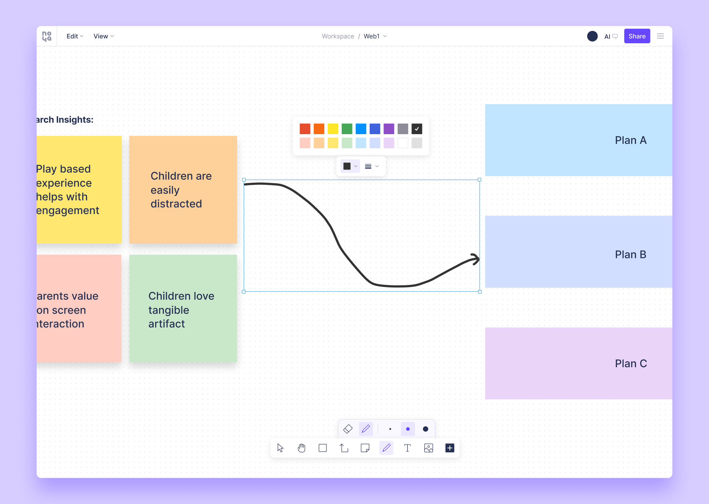 Whiteboard provides essential features and serves as the first surface for integrating multiple Noya tools in one workspace.