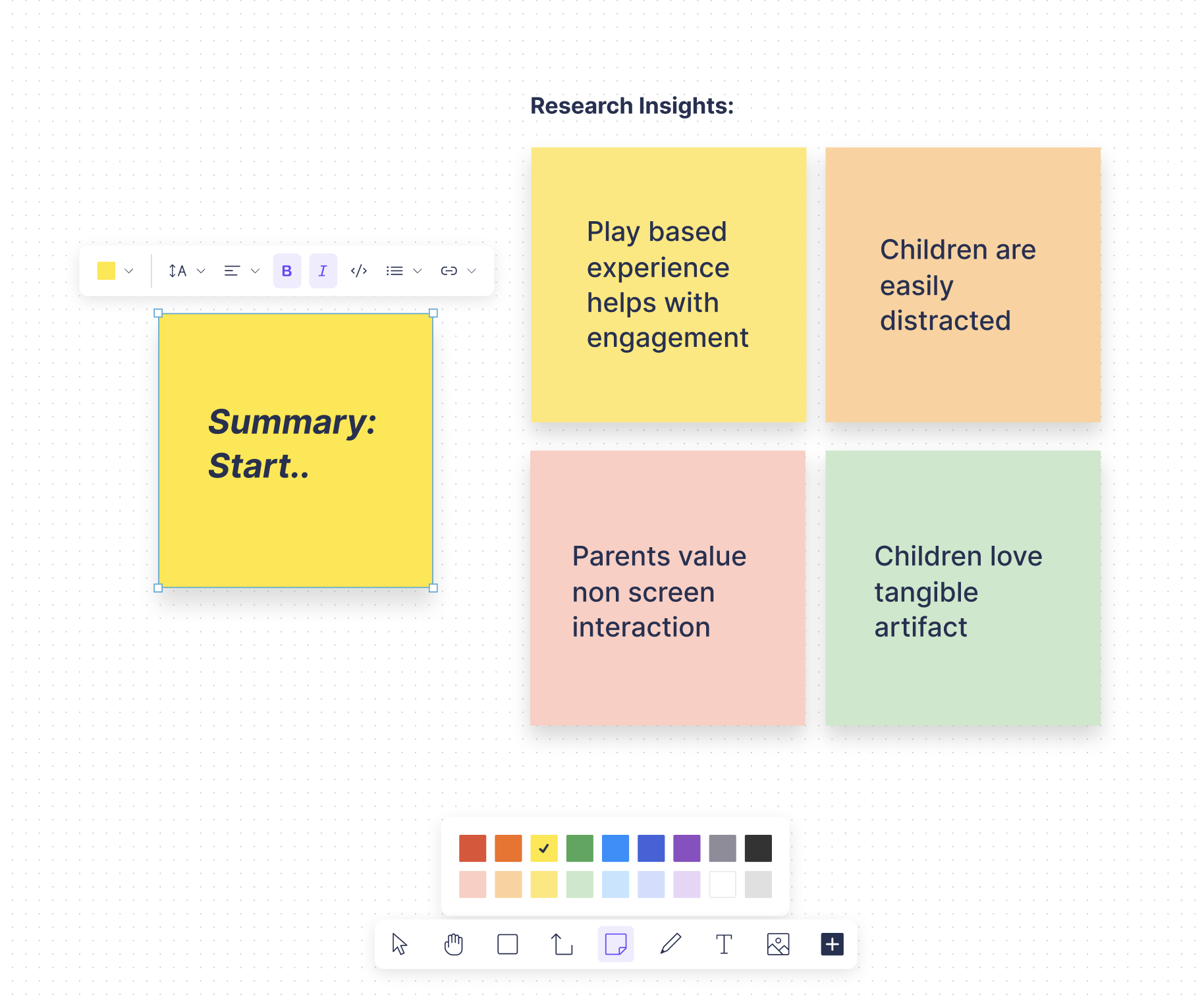 I designed the whiteboard editor to be familiar, modular, and lightweight. It is easy to express ideas quickly while remaining flexible enough to evolve.
